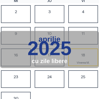14 - | 15 - | 16 - | 17 - | 18 Vinerea M. | 19 - | 20 Paștele |