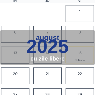 Alege un an pentru a vedea calendarul complet, sărbătorile creștin ortodoxe și zilele libere legale.